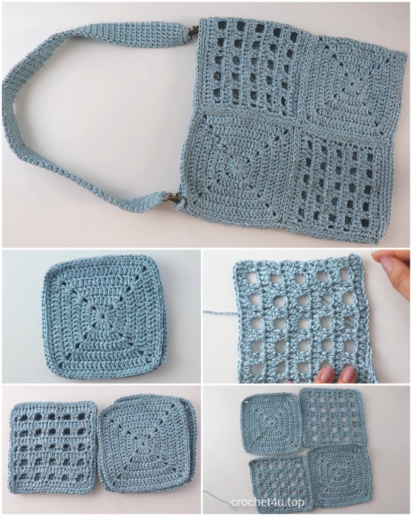 - Construction: The bag is made from four identical squares (two for the front panel, two for the back panel) which are joined together. The sides and bottom are seamed, and the strap is added last.