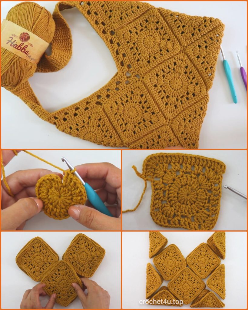 Step out in style with The Golden Hour Sunburst Tote! This bag features a bold, sunny mustard color and a unique construction from four lacy crochet squares. Once the squares are joined, the resulting rectangle is cleverly folded into a sharp, triangular shoulder bag—a perfect accessory for market trips, beach days, or adding a pop of color to your everyday wear.