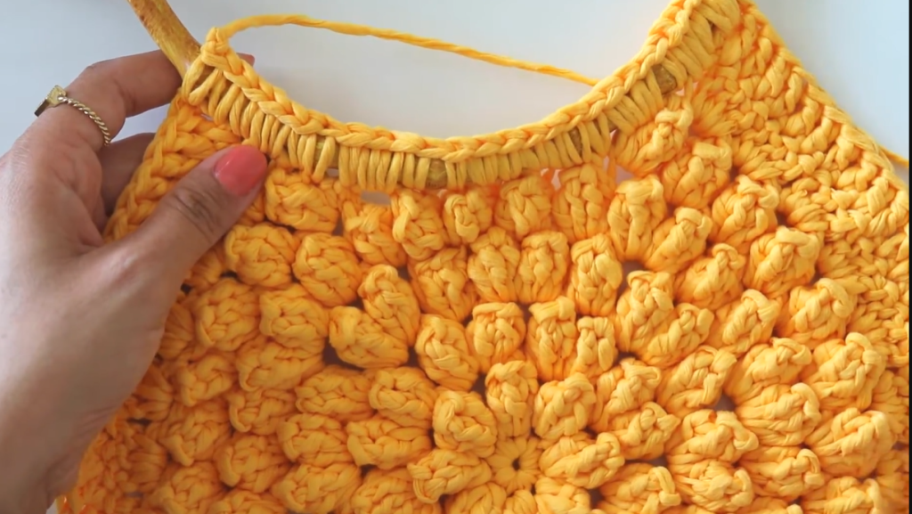 - Ch 1, turn. You will now work back and forth along the top edge of the bag, wrapping the handle.