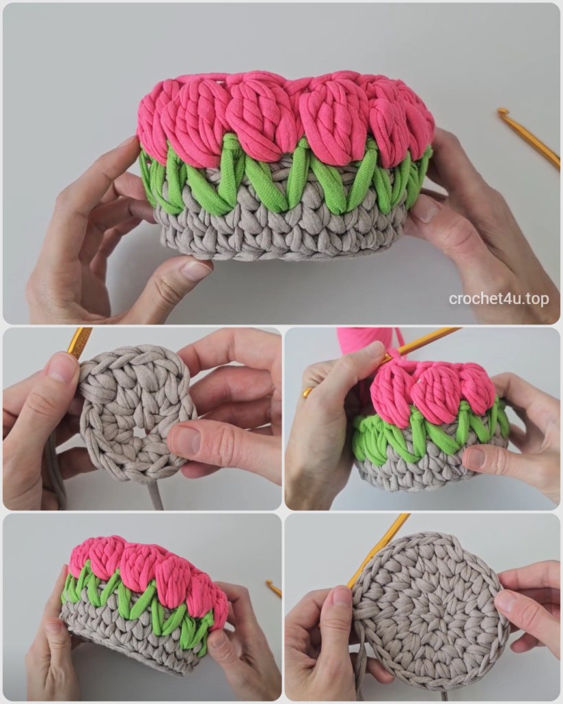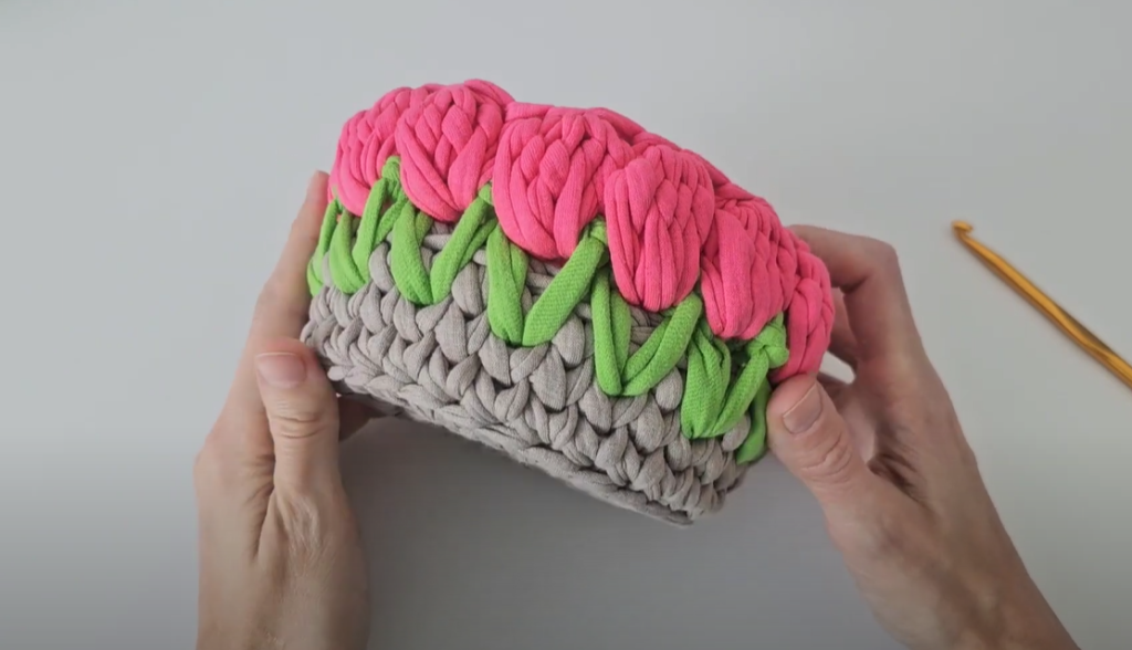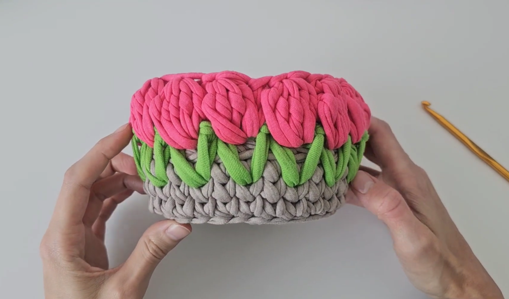 Hello, decorative crocheters and flower enthusiasts! Get ready to bring a perpetual spring into your home with the exquisite Spring Bloom Tulip Basket. This container is a true showstopper, utilizing three contrasting colors of chunky T-shirt yarn to create a detailed band of colorful tulips around the rim.
