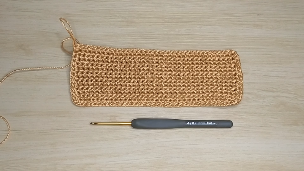 The bag starts with a flat rectangle worked in rows of single crochet, followed by a final shaping round.