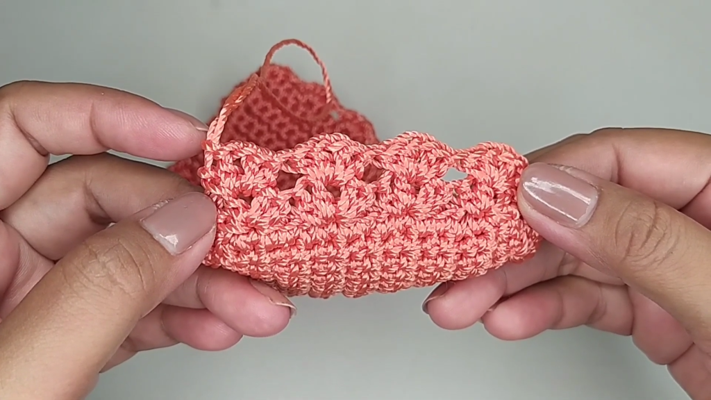 The main body of the bag is created using the 4HDC-Shell stitch, worked in unturned rounds (always on the right side) to emphasize the texture.