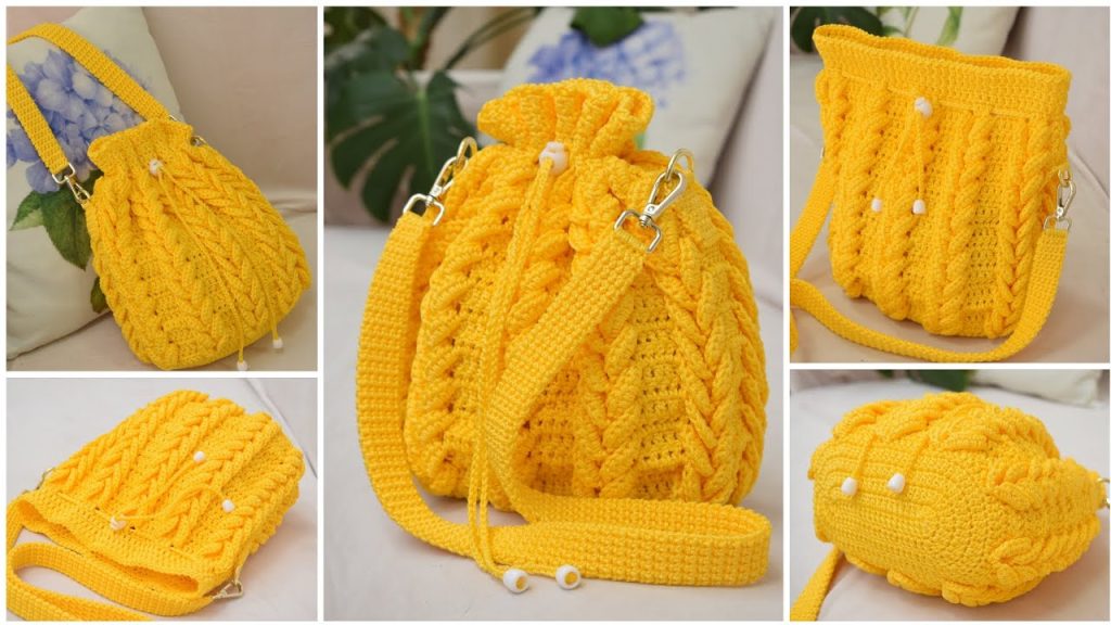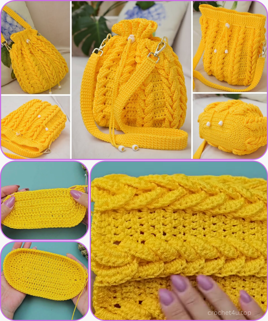 This bag is crocheted using a combination of foundational double crochet rows and a complex-looking, yet accessible, braid stitch motif. The drawstring top allows for a functional and adjustable closure, making it the perfect everyday project.