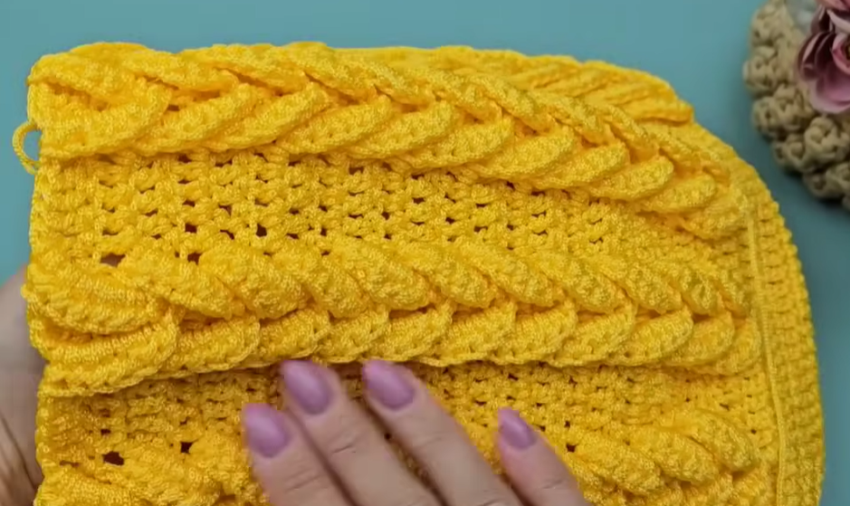 3. Row 9 (Braid Row 2): This row is the same as Row 7, but the anchor for the Braid Motif (the Sl st) will be worked into the DC post of Row 7, directly below the central 5-DC gap from Row 7. This creates the staggered, braided look.