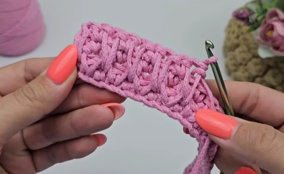 - RSC (Relief SC) over the next LSC (the long stitch from Row 1).