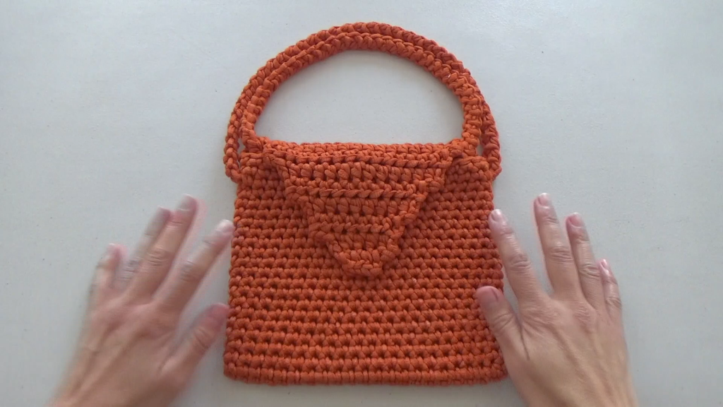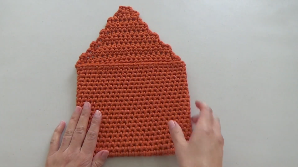 This piece is worked first in a spiral round for the base, then transitioned to rows for the flap.