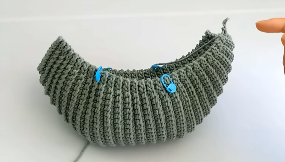 This long strip creates the “walls” and the bottom of the bag. We work in BLO (Back Loop Only) to create a ribbed texture that allows the gusset to bend smoothly around the curves of the circle.