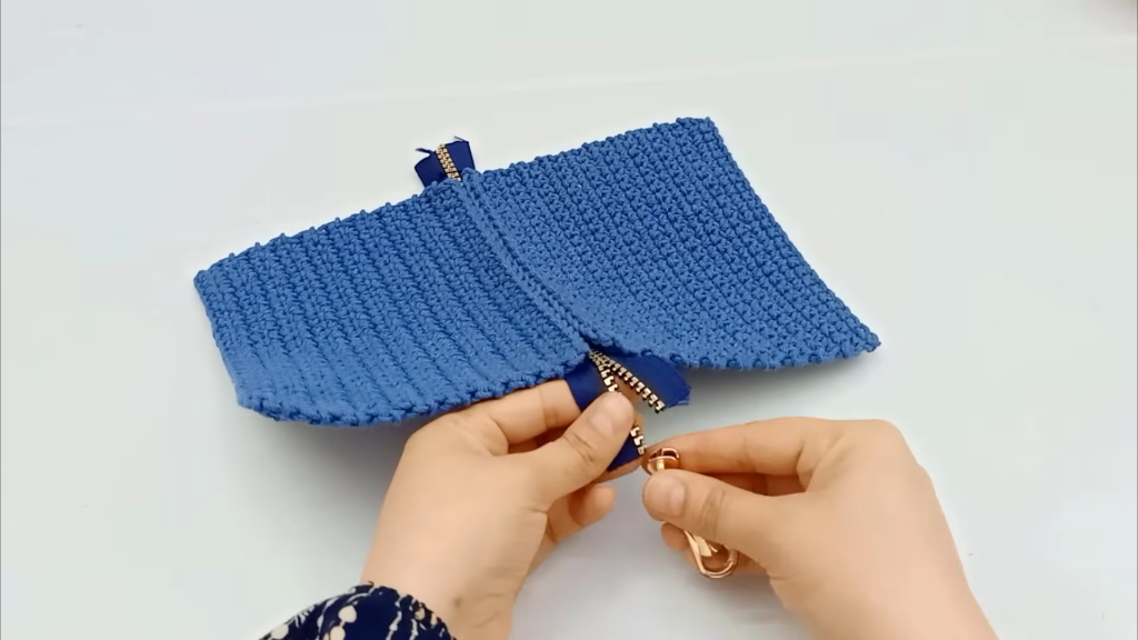 - Using a needle and matching thread, sew the zipper tape to the edge, just below the first row of crochet.