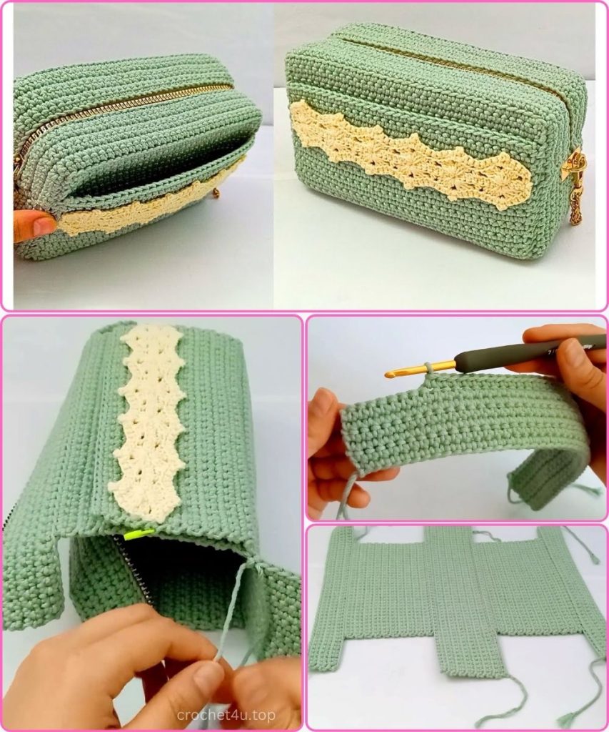 [1 SC, 2 ch, Slip Stitch into the base of the chain, 1 SC](this creates a tiny picot). Work 1 SC in the next 3 DC. Skip the HDC and repeat. - Attachment: Sew this lace trim onto the top edge of your inner pocket for a beautiful peek-a-boo effect.