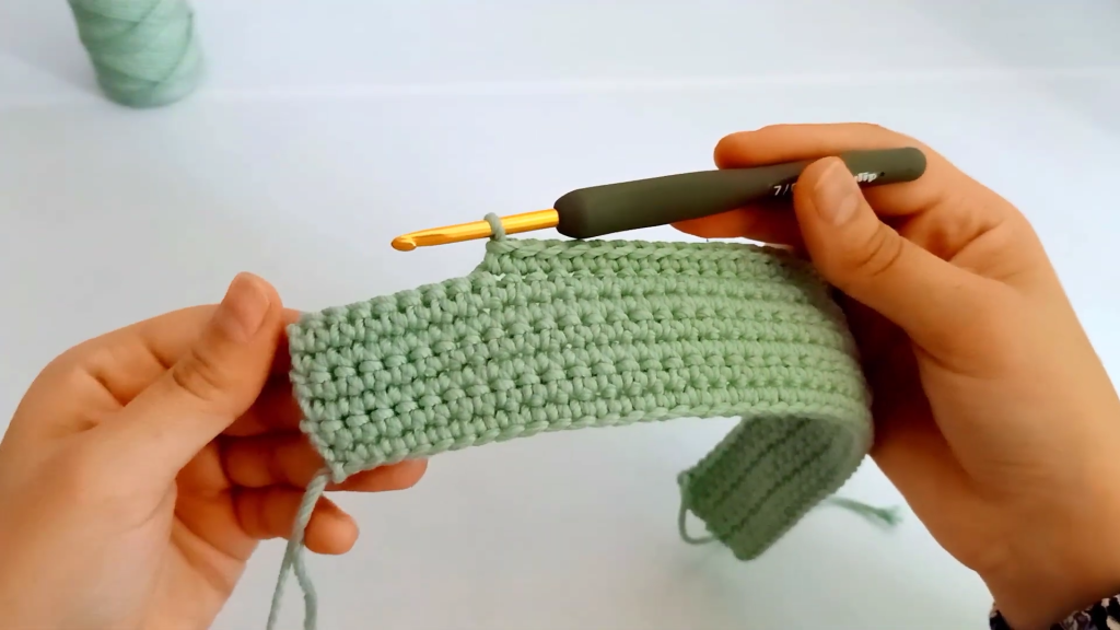 - Row 1: From the second chain, work 8 SC, then 33 SC into the front loops of the previous row, and finally 8 SC on the last chains. Total: 49 stitches.
