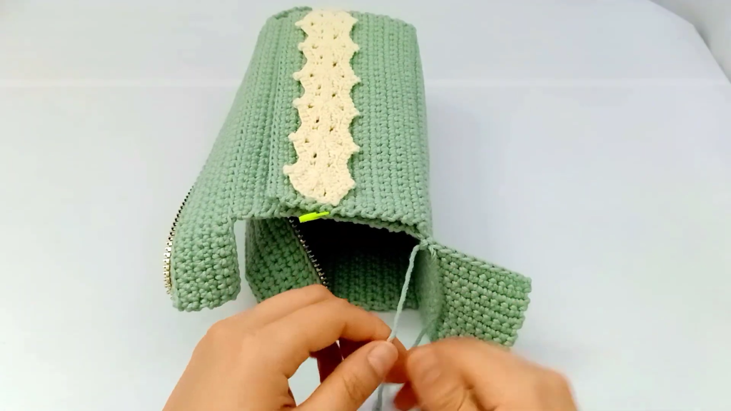 - Final Closing: Sew the remaining edges row-by-row. Because of the extra two rows at the base (14 rows vs 6+6), these two rows will perfectly accommodate the width of the zipper tape.