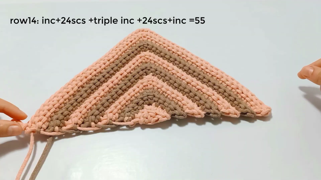 - Row 15 (The Transition): Chain 1, turn. Decrease (SC2tog) over the first two stitches. SC across until you reach the center peak. Work 3 SC in that center stitch. SC across until you reach the last two stitches, and work a decrease.
