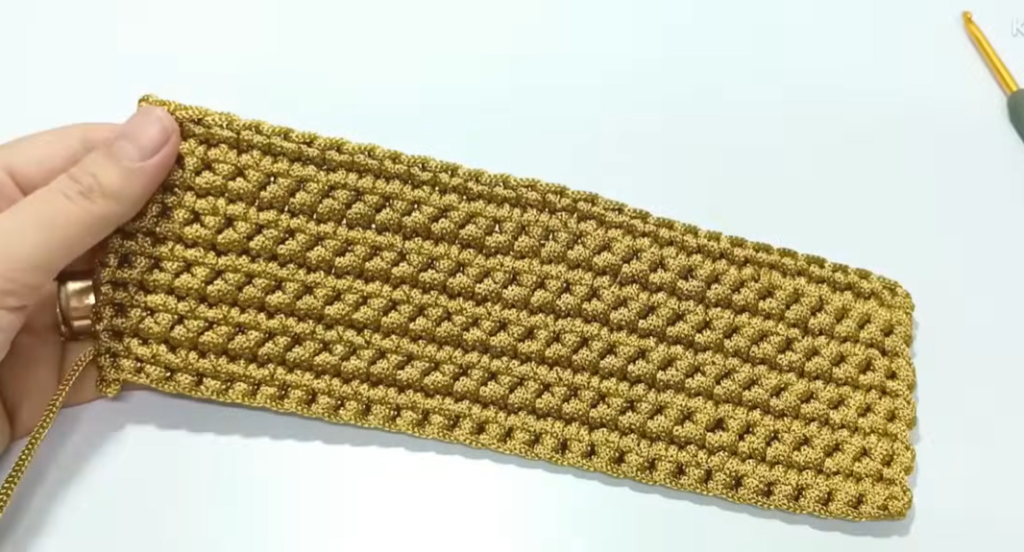 - Completion: Work for 10 rows. After 10 rows, your base should measure roughly 22 cm in length and 8 cm in width.