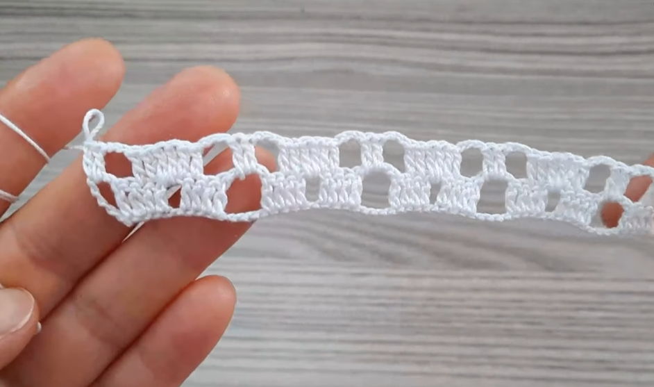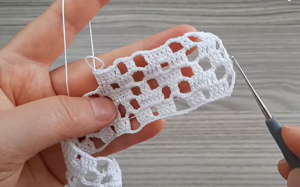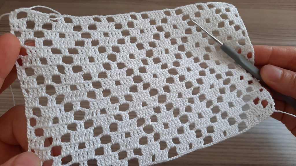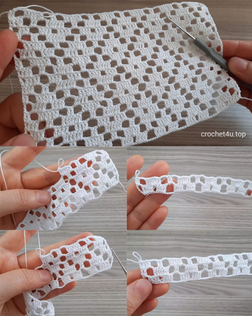 Row 1 (Foundation Net – RS): Chain the required amount (e.g., ch 101). dc in the 5th ch from the hook (counts as dc and ch 1).