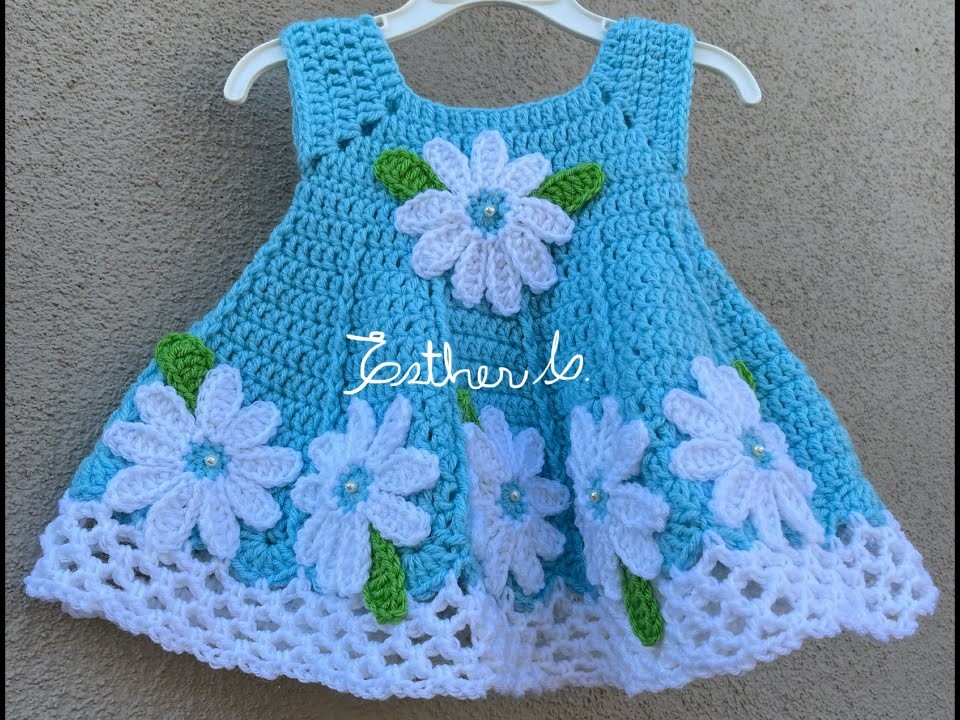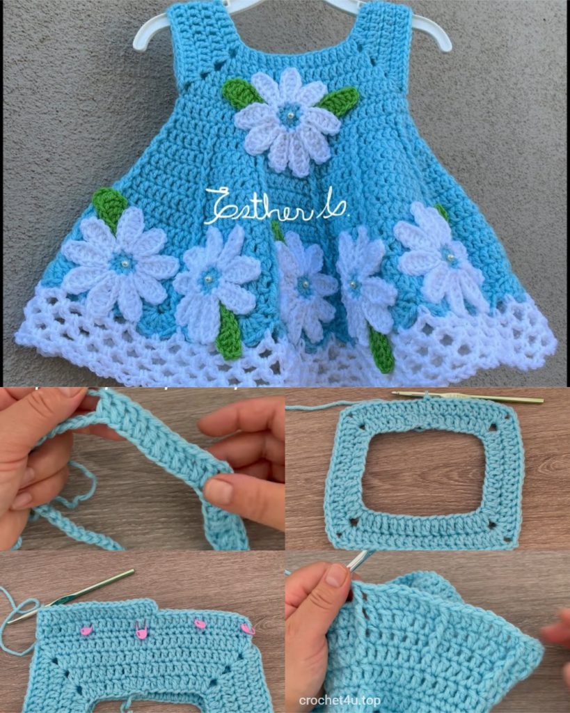 What could be sweeter than a hand-crocheted dress for a little one? This Daisy Dreams Baby Dress captures the essence of spring and summer with its beautiful sky-blue color, flared A-line skirt, and charming 3D daisy appliqués. This pattern is designed for an intermediate crocheter comfortable with basic garment construction and simple appliqué work.