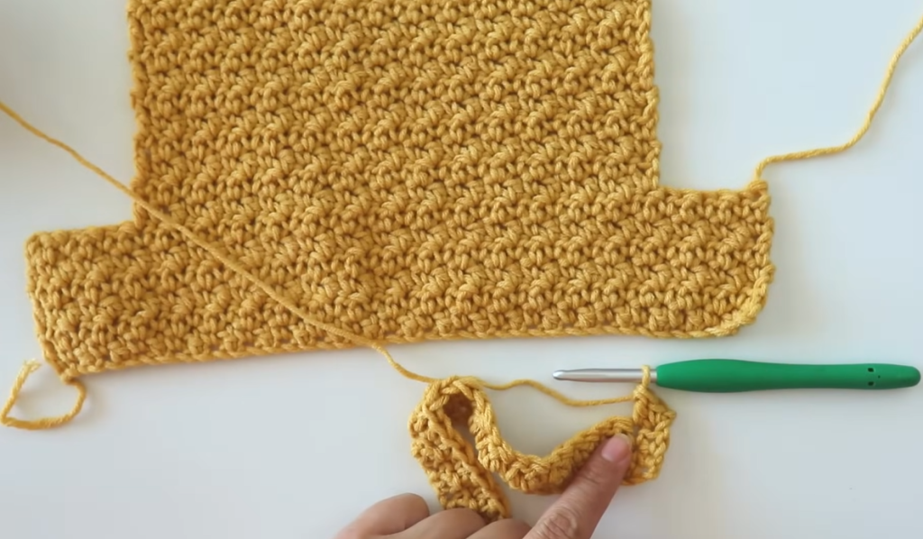- Front Right Strap: Attach yarn at the outermost corner of the front right armhole opening. Ch 1. Work LPS across the 15 sts you skipped in Row 21. (15 sts)