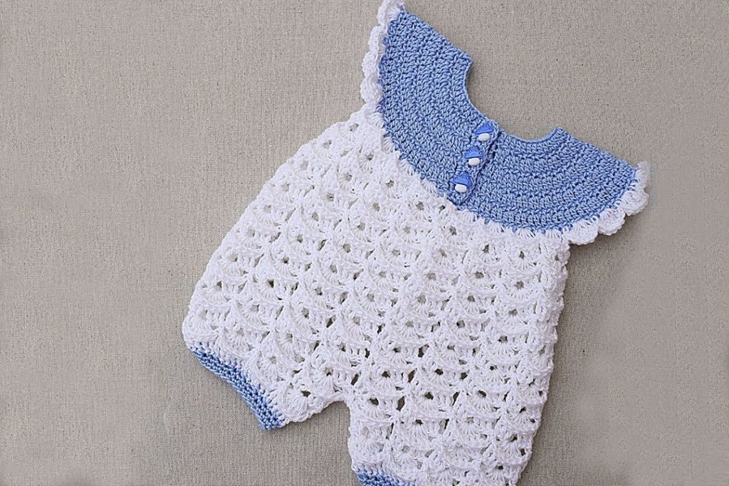 This pattern is designed for the 6-12 Month size and is for the Advanced Intermediate crocheter due to the shaping required for the collar and the bloomer legs.