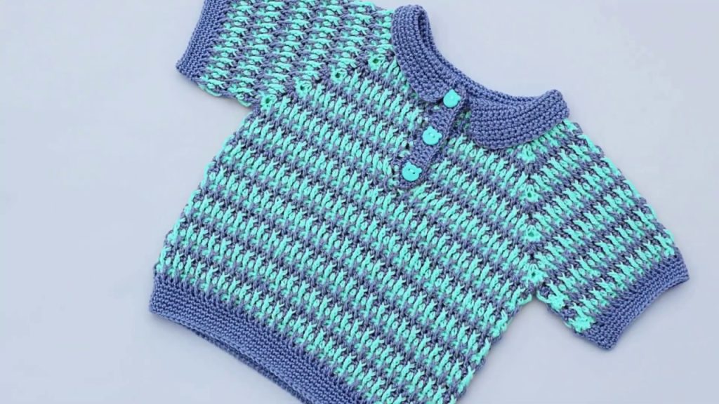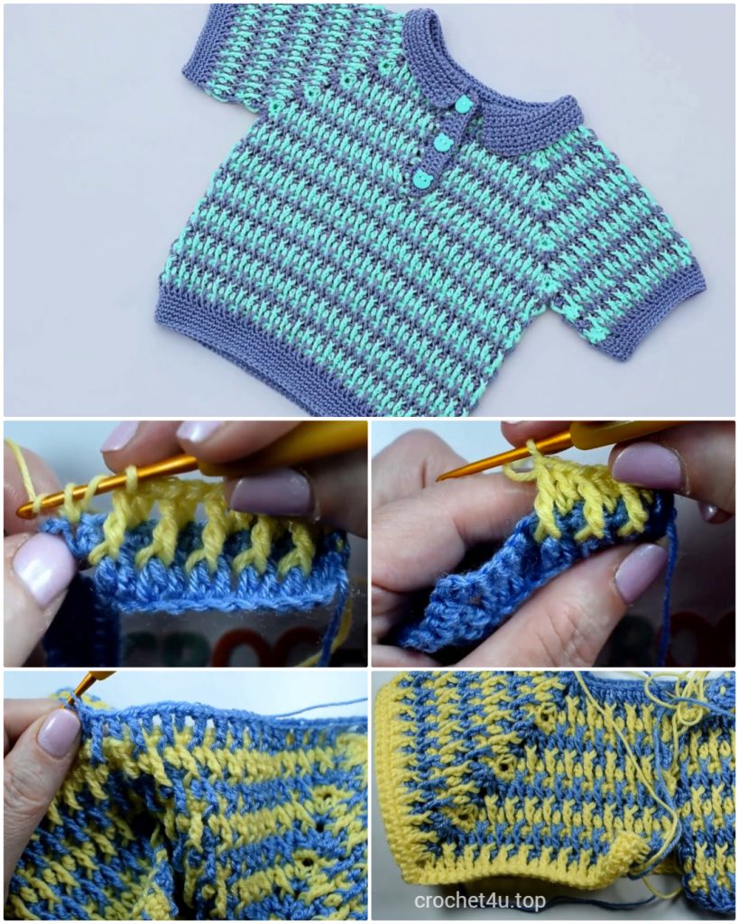 1. Row 4 (Collar Setup – BLO): Ch 2, turn. Hdc in the BLO of each st across the neck edge only. Leave the front placket sc rows unworked. (Approx. 52 hdc)