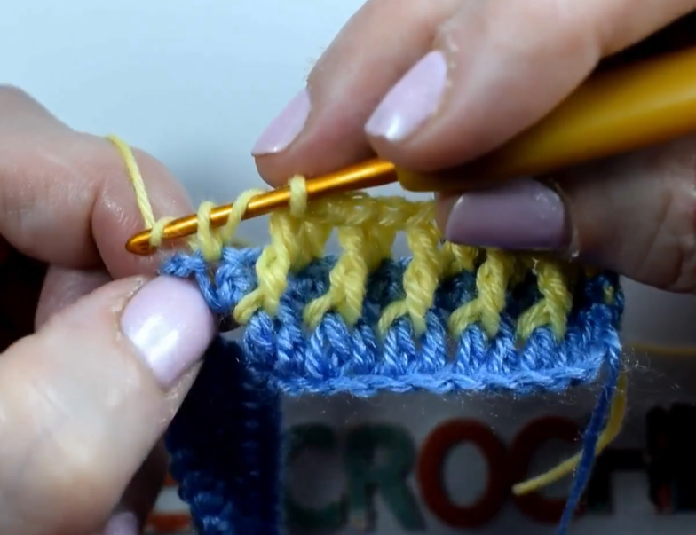 • Row B (Color 2): Hdc in the first st. [Sc in the next st, hdc in the next st] rep across. (Note: This is also known as the Lemon Peel or Griddle Stitch worked in two colors.)