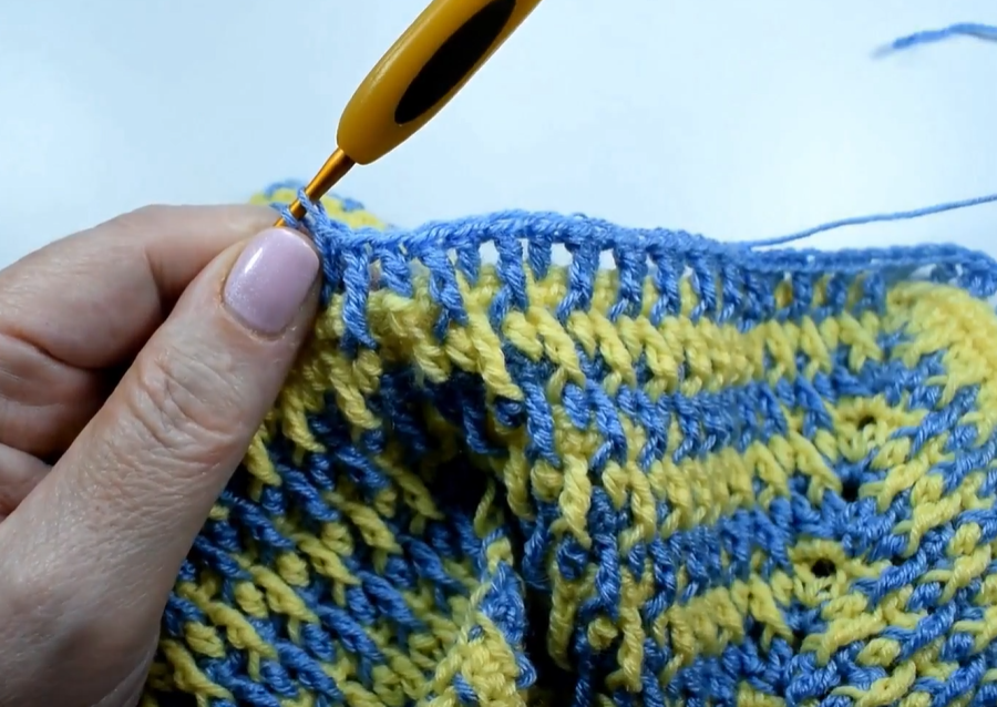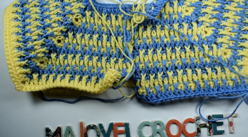 Row 14 (MC – TTTS Row B): Ch 2, turn. Work the TTTS Row B across the body and work 4 TTTS sts (2 sc/2 hdc pairs) evenly into each ch-4 underarm space. Do not join the round; continue working flat.