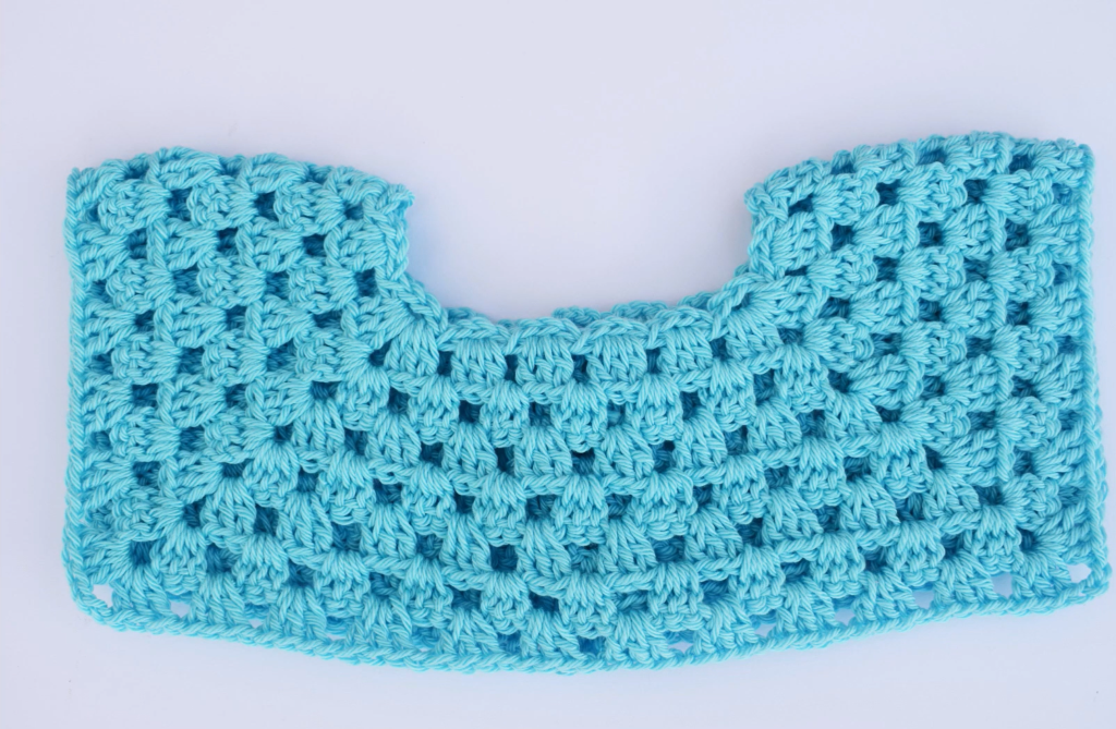 - Neckline: Attach yarn at the back opening. Work 1 round of sc evenly around the entire neckline. Sl st to join.