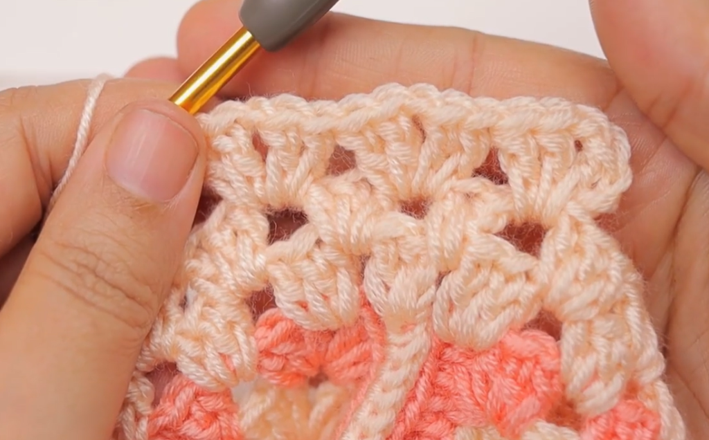 - Join yarn (continue with the same yarn color or change to a lighter shade for the transition) into any corner Ch-2 sp on the bottom edge of the yoke.