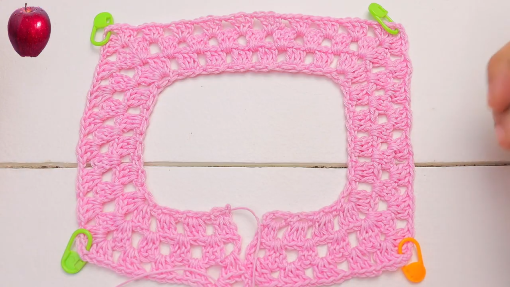 - Next Row (Armhole Row – Shells): Work the shell pattern across the first Back Panel. When you reach the first corner Ch-1 sp, work a 5 Dc Shell into the corner sp. Ch 2 (underarm chain). Sk all stitches across the Sleeve Panel up to the next corner Ch-1 sp. Work a 5 Dc Shell into that corner Ch-1 sp. Continue the shell pattern across the Front Panel. Repeat the Ch 2, Sk Sleeve step for the second armhole. Work the shell pattern across the last Back Panel. Join with Sl St to the beg Ch 3 to form a circle. FO.