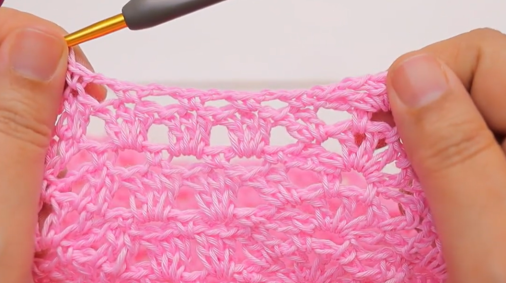 Row 5 (Solid Row): Dc in each Dc, working 1 Dc into the Ch-1 sp of each corner. Ch 3, turn. (This converts the shell row back to a base for the next row of shells.)