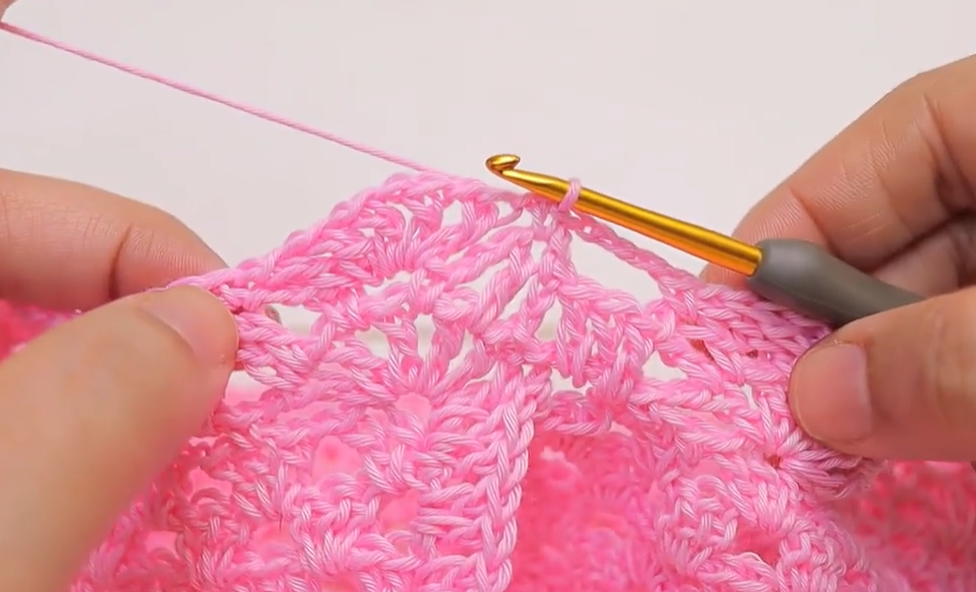 - Round 3 (Shell Setup): Ch 3 (counts as 1st Dc), 2 Dc in the Ch-1 sp. Sk 2 sts, Sc in the next st. Sk 2 sts, 5 Dc Shell in the next Ch-1 sp. Rep from the parentheses around. End with Sk 2 sts, Sc in the last st. Work 2 Dc in the beg Ch-1 sp. Join with Sl St to top of Ch 3. (A multiple of 5 shells).