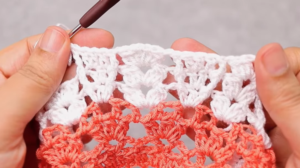 The skirt is worked in the round using Yarn B (White). The skirt pattern is a beautiful repeating V-stitch and shell combination.
