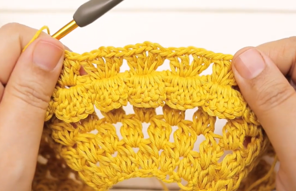 - Final Round: End on a Shell in Sc round (like Round 3). Work one final Sc in the center Dc of the last shell. FO. The final row of shells creates the lovely, pronounced scallop seen at the bottom hem.