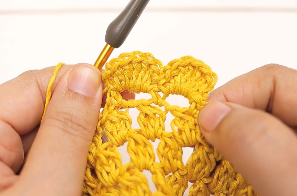 - Corner 2: Work (5 Dc Shell, Ch 1, 5 Dc Shell) into the next Sc.