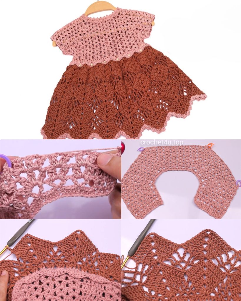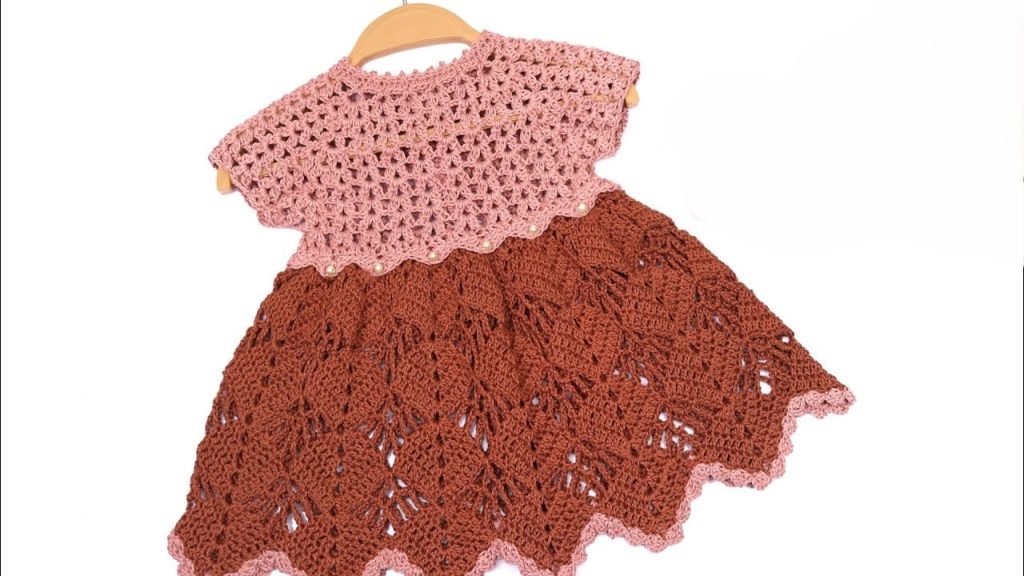 Hello, stylish crafters! Prepare to crochet a sophisticated and absolutely stunning garment: the Mocha Blossom Dress. This design is a study in texture and contrast, pairing a delicate, lacy Dusty Rose yoke with a richly textured Mocha Lace Skirt. The skirt’s flowing shell pattern creates a beautiful diamond or leaf motif, and the final touch of pearl embellishment at the waist elevates the entire look.