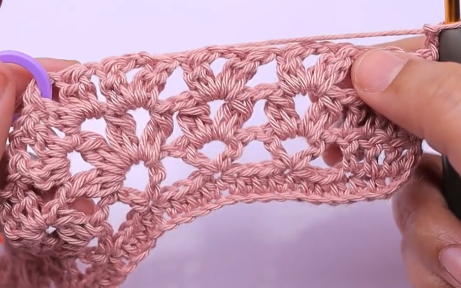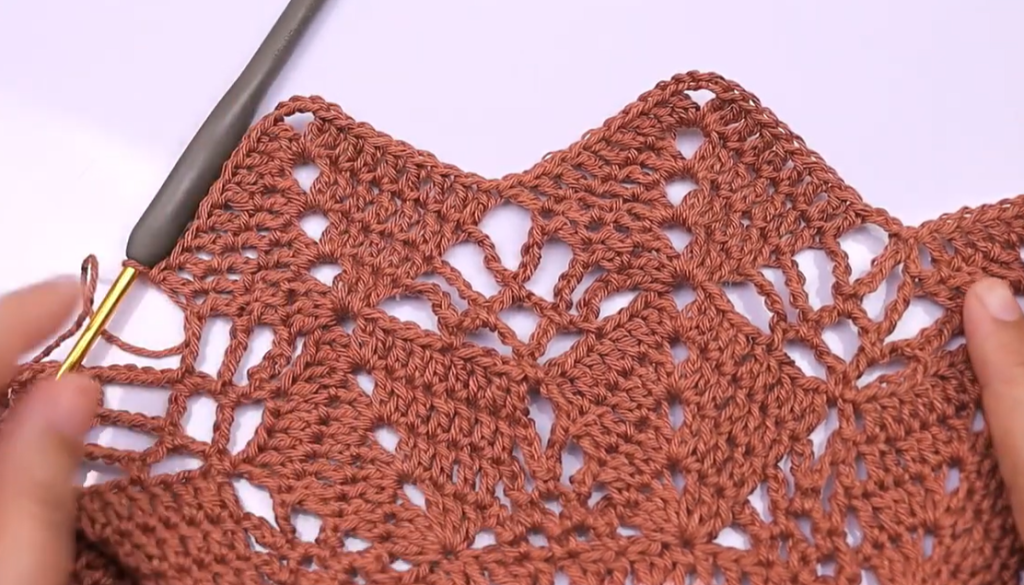 - Row 4 (V-Stitch): Work V-st in the center Dc of the previous V-st. Work (Dc, Ch 2, Dc) in each Ch-2 corner sp. Ch 3, turn.