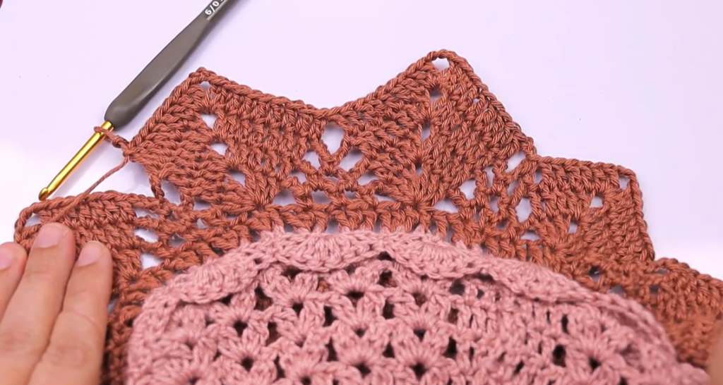 - Final Hem Border: Join Yarn A to the bottom scallop hem. Ch 1, Sc evenly around the edge, working 3 Sc into the top of each 7-Dc Shell and 1 Sc into each Sc anchor. FO. This adds a beautiful contrast trim.