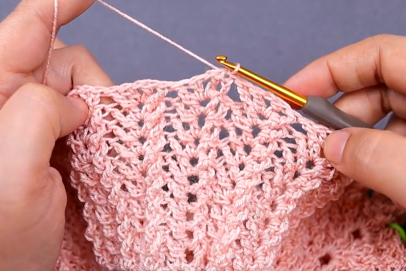 - Row 4 (V-Stitch): Work V-st in the center Dc of the previous V-st. Work (Dc, Ch 2, Dc) in each Ch-2 corner sp. Ch 3, turn.