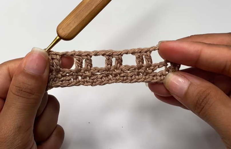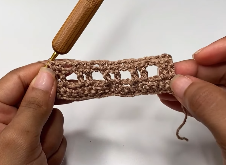 This row creates the horizontal spacing. We are using Single Crochets (SC) to keep the profile low.
