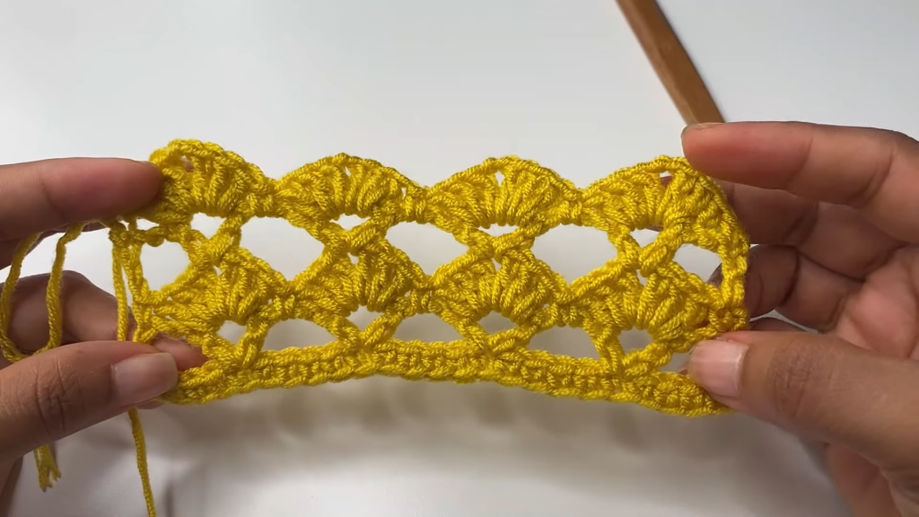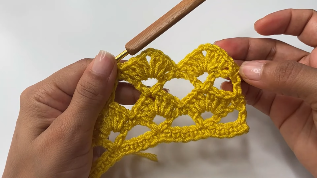 - Row 3 (The Shell Row): This row fills in the V-stitches with the large Shell motifs.