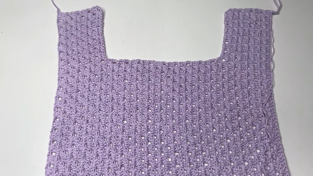 - Shaping the Neck/Shoulders: As demonstrated, once you reach the shoulder section, you temporarily stop working the full width and only work across the outer sections of the panel, leaving a gap in the center for the neck opening. You then chain across that gap later to complete the shoulder width.