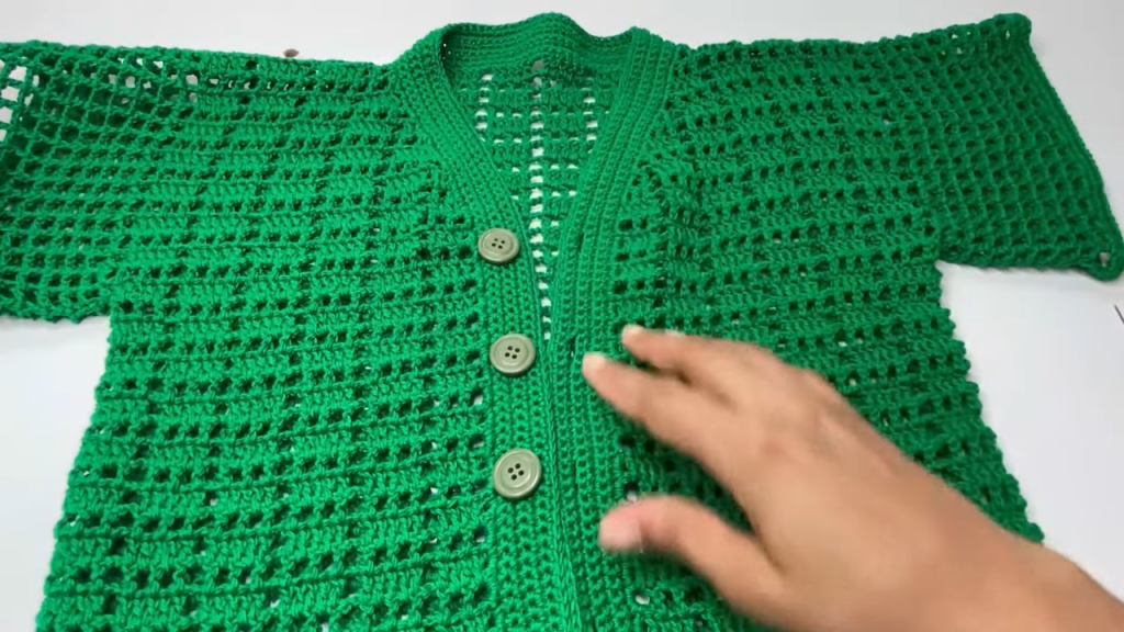 - Work multiple rows of Single Crochet (SC) along the straight front edges of both panels. The video uses approximately four rows. This creates a stable base for the buttons and buttonholes.