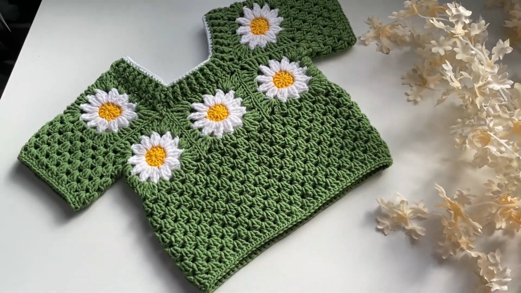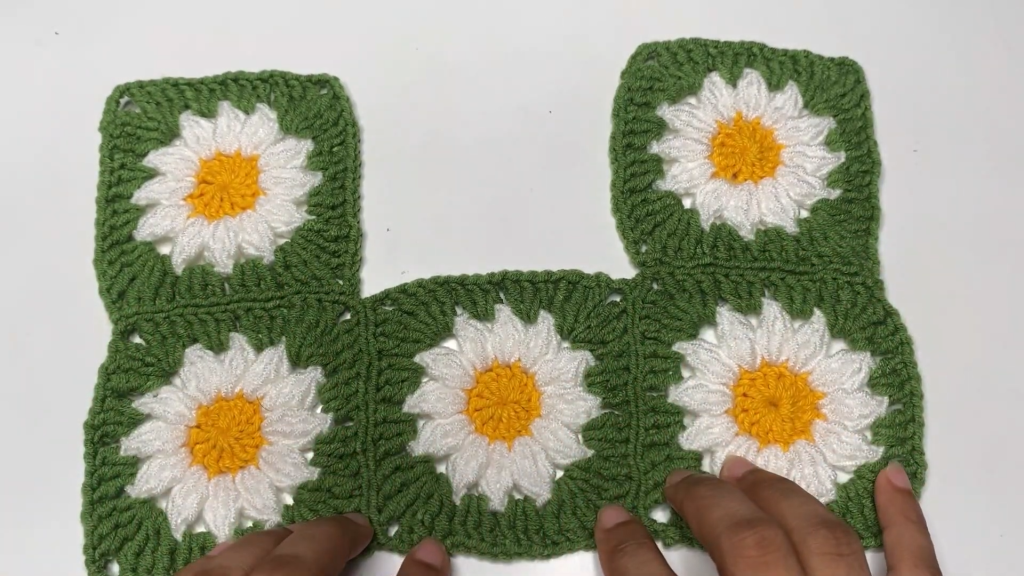 - Shoulder Seams: Once the front and back rows are complete, align them and seam the side sections of the top motifs together to form the shoulder seams, leaving a space for the neck opening.