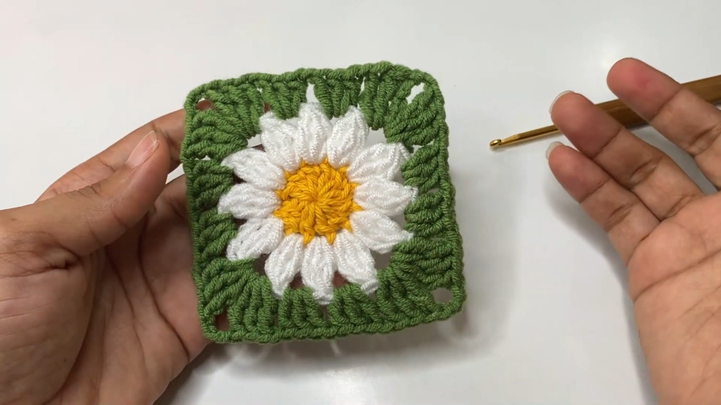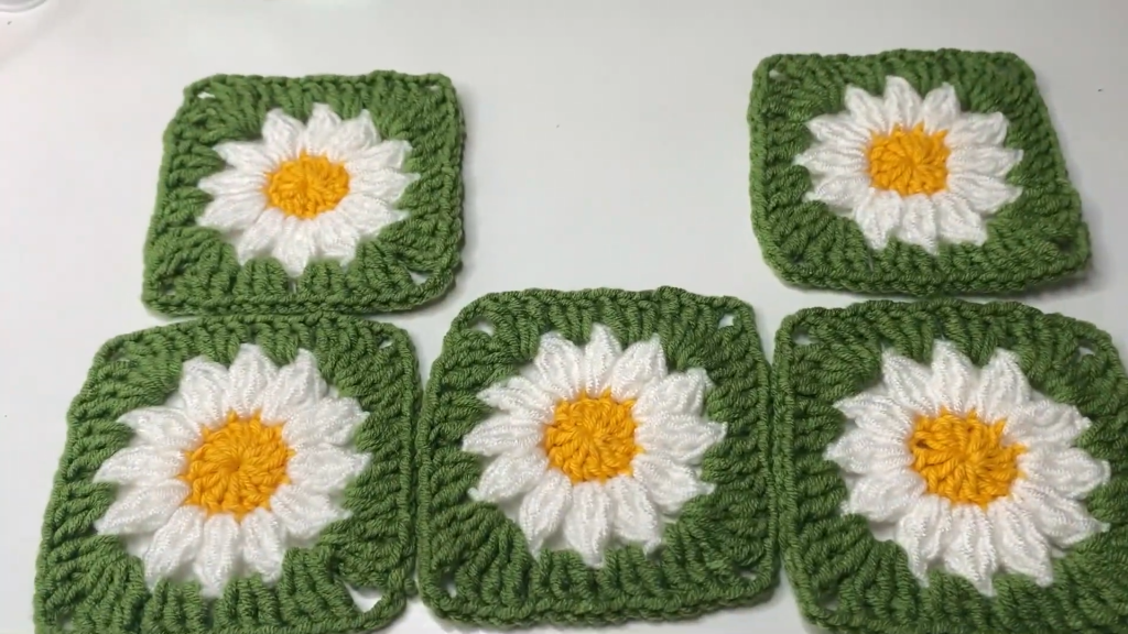 - Color Planning: You will need at least three colors for the full “Sunburst Bloom” effect (Center, Petals, and Square Edge), plus a main color for the joining, hem, and sleeves.
