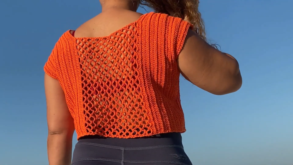 What makes this pattern truly remarkable is its construction. We start by working the garment width-wise, creating the shoulder and upper sleeve first, and then build the body downward with our stunning lace stitch. This top is constructed from two identical panels, making the sizing and seaming straightforward.
