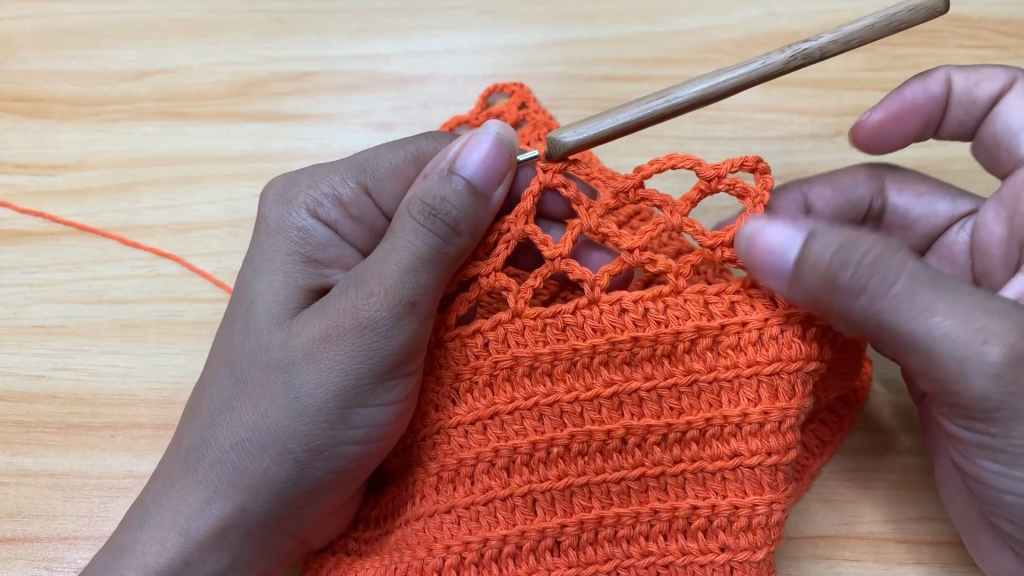 - Repeat the sequence: [Ch 5, Sk 3 st/spaces, SC in next st/space] up the side of the work until you reach the stitch marker.