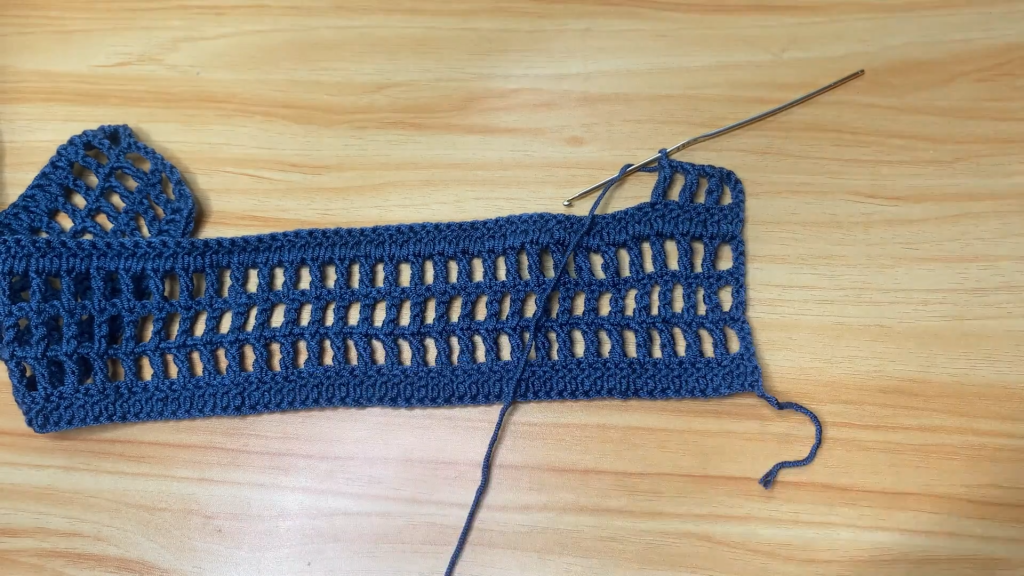 - Sleeve Foundation (Mesh Start): The side seam creates a horizontal foundation of DCs. The sleeve is worked in the same 4-row pattern, worked in the round.