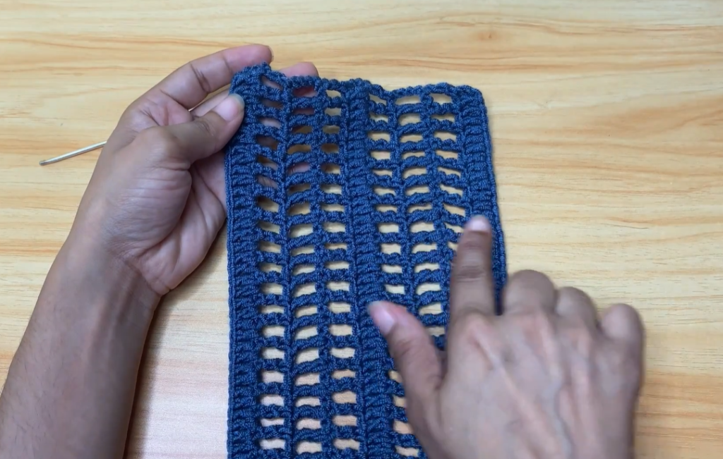 - Continue repeating the 4-row sequence (DC infill, Tr mesh, Tr mesh, Tr mesh) until the panel measures your desired Shoulder-to-Shoulder Width (e.g., 38 cm in the video).