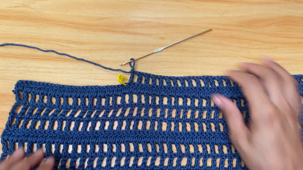 - Work the Pattern: Work the 4-row sequence until the piece measures the width from the hem to the intended Neckline Drop point (e.g., 2 full repeats of the 4-row pattern in the video).