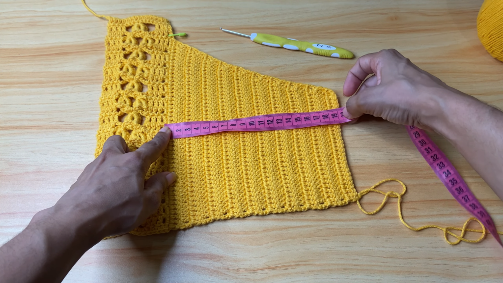 - Base Row: Work 2 SC for every horizontal DC row edge along the side of the center panel. Leave the top 3 rows of the center panel unworked (place a stitch marker here) to form the armhole/neckline transition.