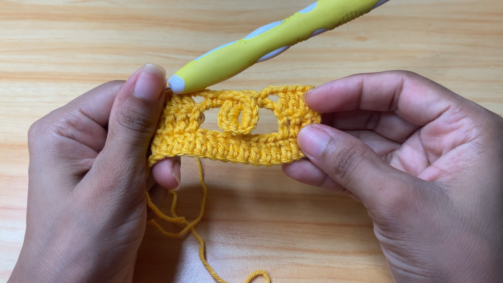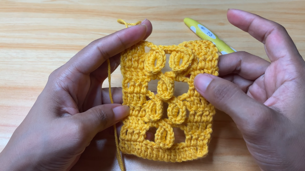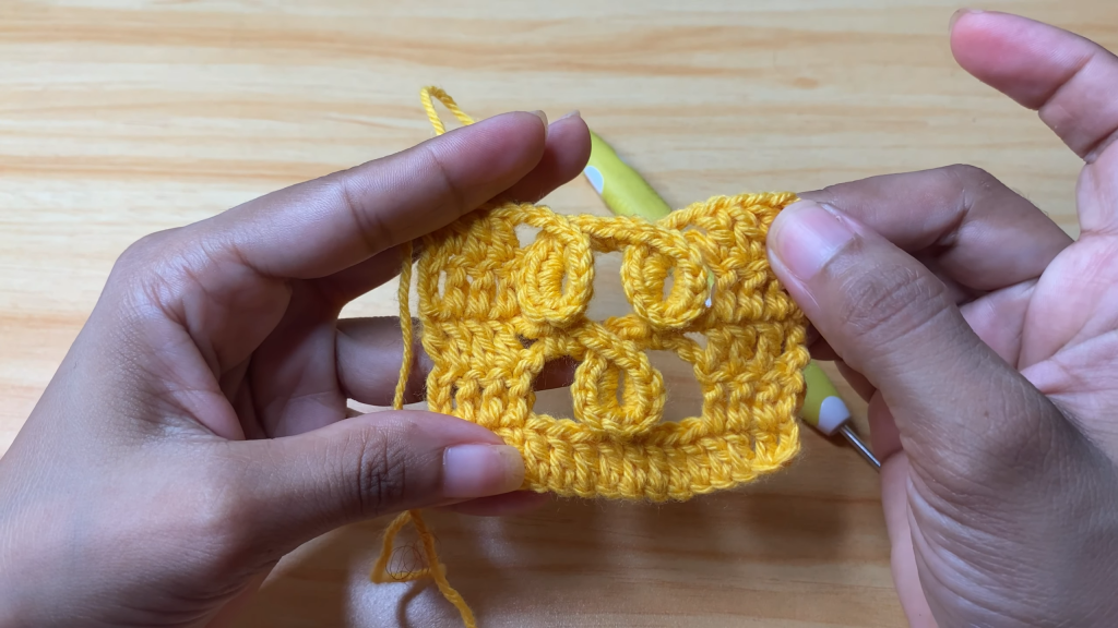 - Ch 3, SC into the next Ch-4 space. Ch 3, DC in the last 4 sts.
