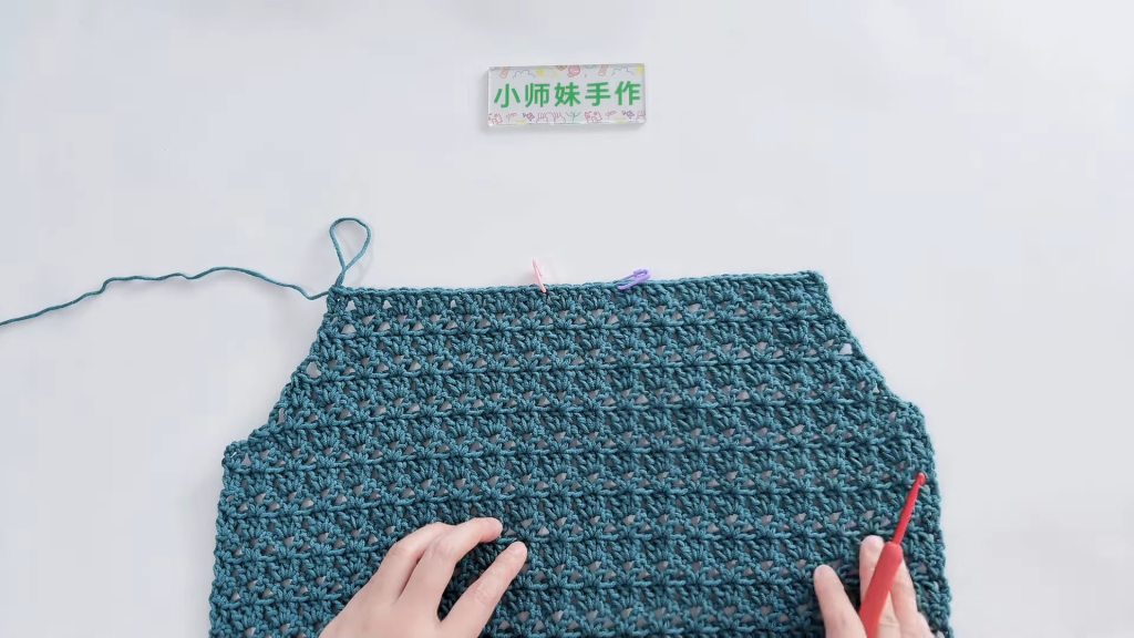 Once the chest height is reached, we divide the work to create the two straps, leaving a gap for the neckline.